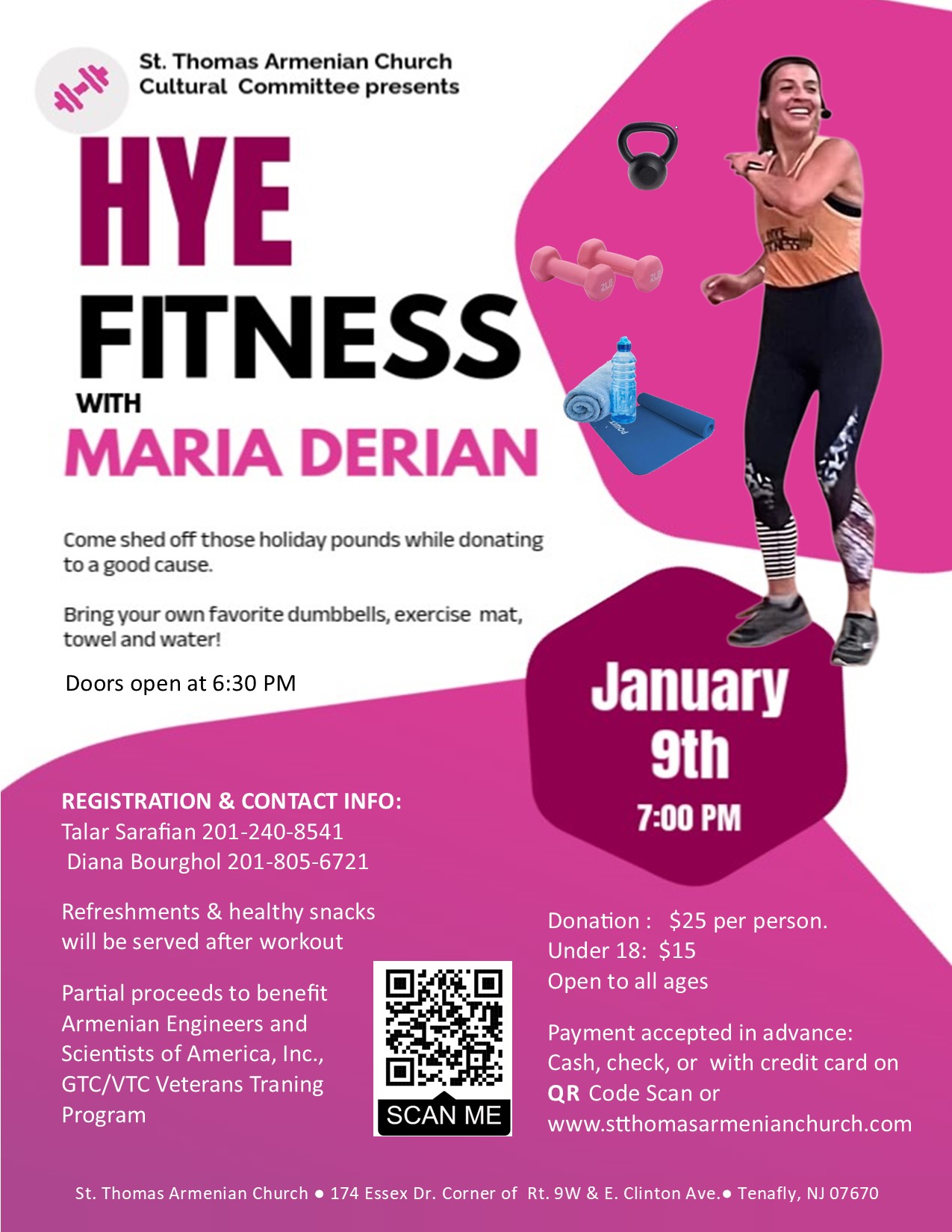 The Cultural Committee of St. Thomas Church of Tenafly, NJ, will present “Hye Fitness with Maria Derian,” on Thursday, Jan. 9, 2025, at 7 p.m. (doors open at 6:30 p.m.), at the church (174 Essex Dr., Tenafly). Shed holiday pounds while donating to a good cause: partial proceeds benefit Armenian Engineers and Scientists of America, GTC/VTC Veterans Training Program. Open to all ages. Bring your own favorite dumbbells, exercise mat, towel, water. Refreshments and healthy snacks served after workout. Click here to view a flyer with donation and other details; payment accepted in advance (cash, check, credit card) on the parish website. For information contact Talar Sarafian at (201) 240-8541, or Diana Bourghol at (201) 805-6721.