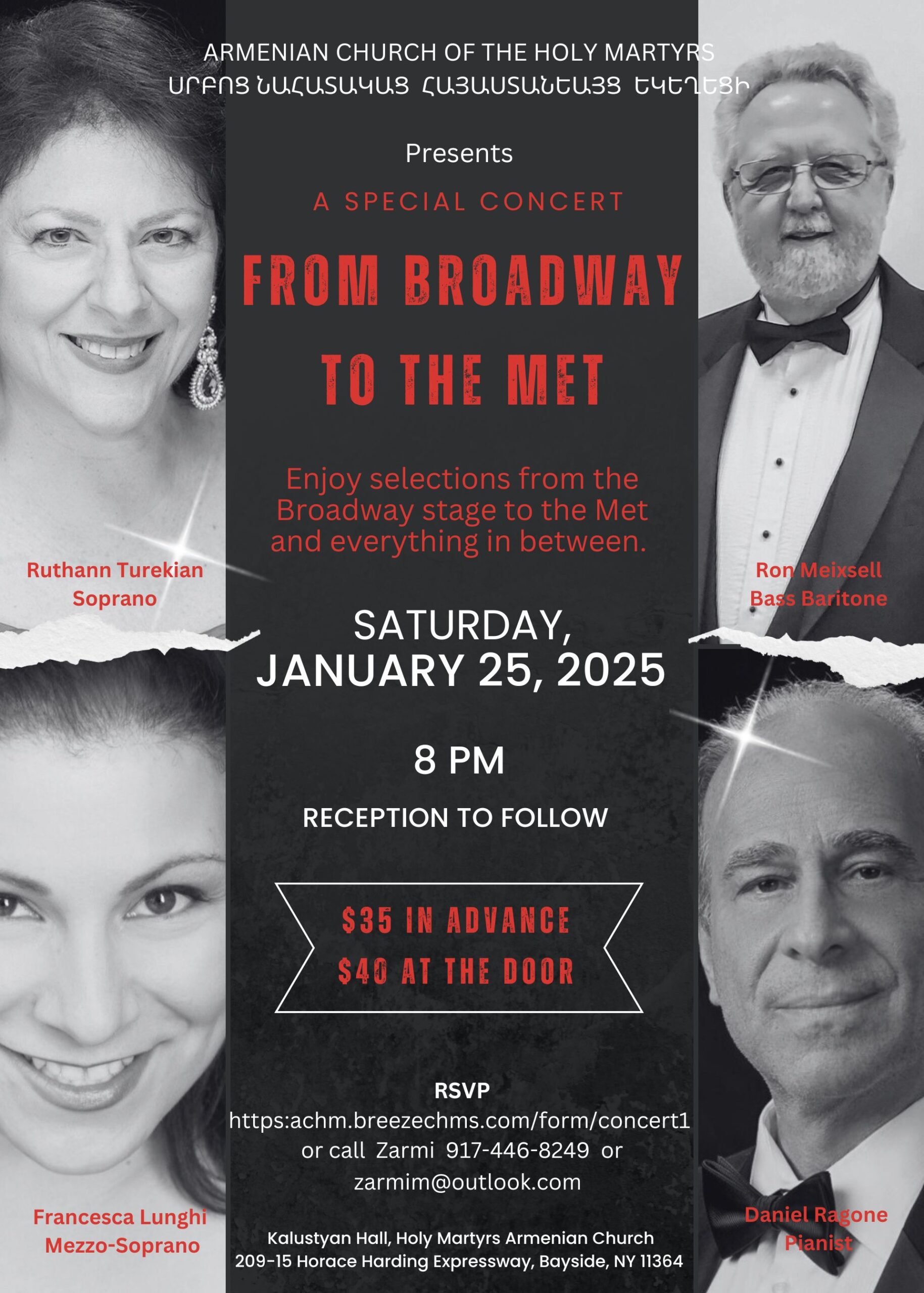 Holy Martyrs Church of Bayside, NY, will sponsor a concert of vocal music, “From Broadway to the Met,” on Saturday, Jan. 25, at 8 p.m., in the church’s Kalustyan Hall. To view a flyer with ticket and other details, click here.