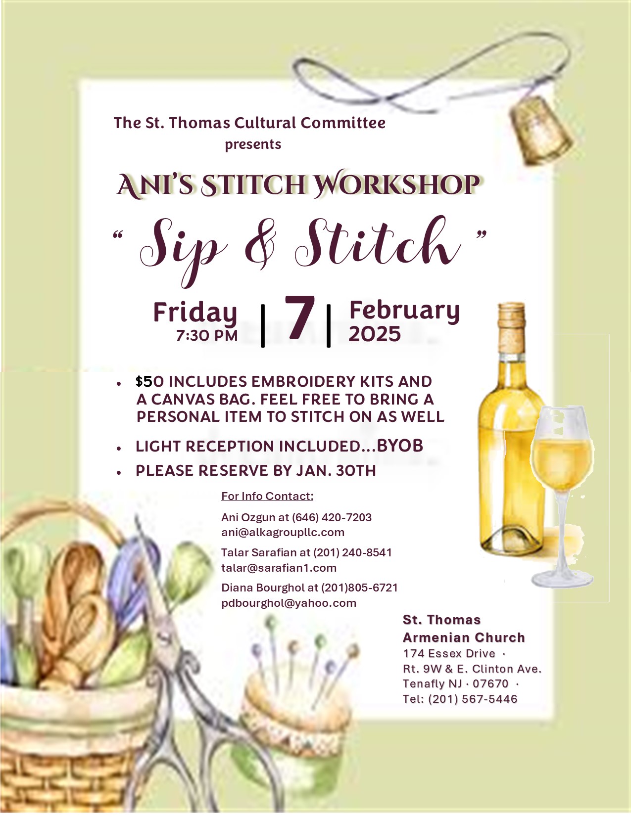 St. Thomas Church Cultural Committee (Tenafly, NJ) will present “Ani’s Stitch Workshop: Sip & Stitch” event on Friday, Feb. 7, at 7:30 p.m., at the church (174 Essex Dr., Tenafly, NJ). There will be complimentary embroidery kits and a canvas bag; you can also bring a personal item to stitch on. Light reception included. Please reserve by Jan. 30. For information, view the event flyer here, or contact ani@alkagroupllc.com.
