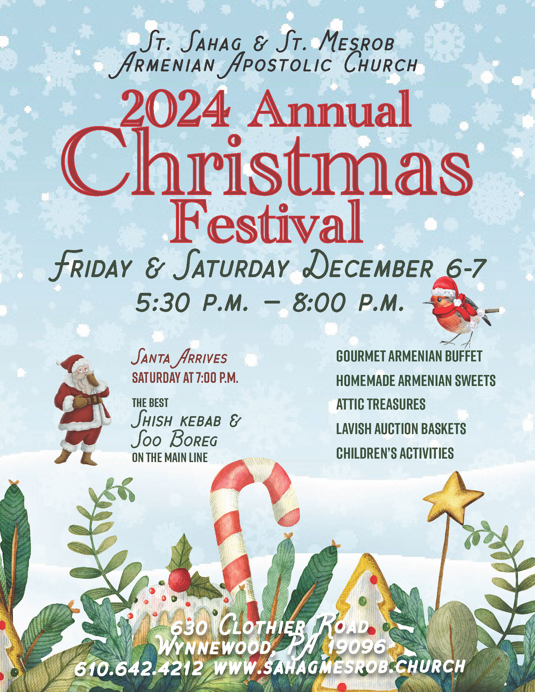 St. Sahag & St. Mesrob Church of Wynnewood, PA, will hold its annual Christmas Festival on Friday and Saturday evenings, December 6 and 7, 5:30-8:30 p.m. at the church facility (630 Clothier Rd., Wynnewood). Traditional Armenian food, raffle prizes, auction baskets, attic treasures table, activities for the children, and a visit from Santa Claus on Saturday night. Contact the church at (610) 642-4212 for information, or click the link to view a flyer.