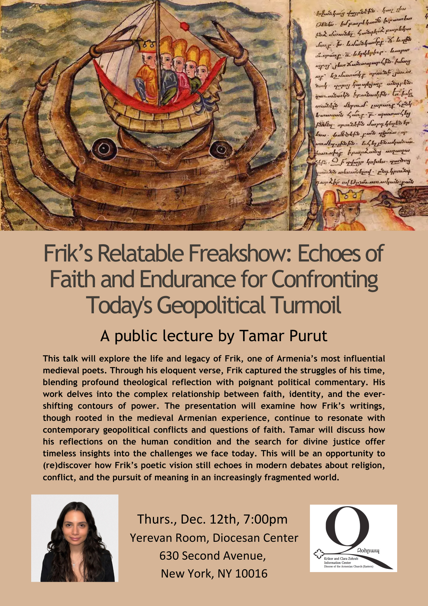 The Eastern Diocese’s Krikor and Clara Zohrab Information Center will host a lecture on Thursday, Dec. 12, at 7 p.m., in Yerevan Room of the Diocesan Center (630 Second Ave., at 35th St., New York City). Tamar Purut will give an interactive talk on the life and legacy of the medieval Armenian poet Frik, titled “Frik’s Relatable Freakshow: Echoes of Faith and Endurance for Confronting Today’s Geopolitical Turmoil.” Admission is free; all are welcome. E-mail zohrabcenter@armeniandiocese.org for details. Click here to view a flyer; learn more on the Zohrab Center website.