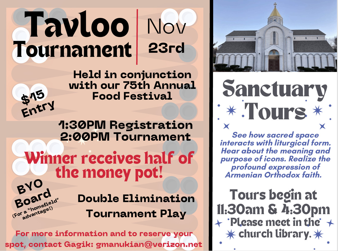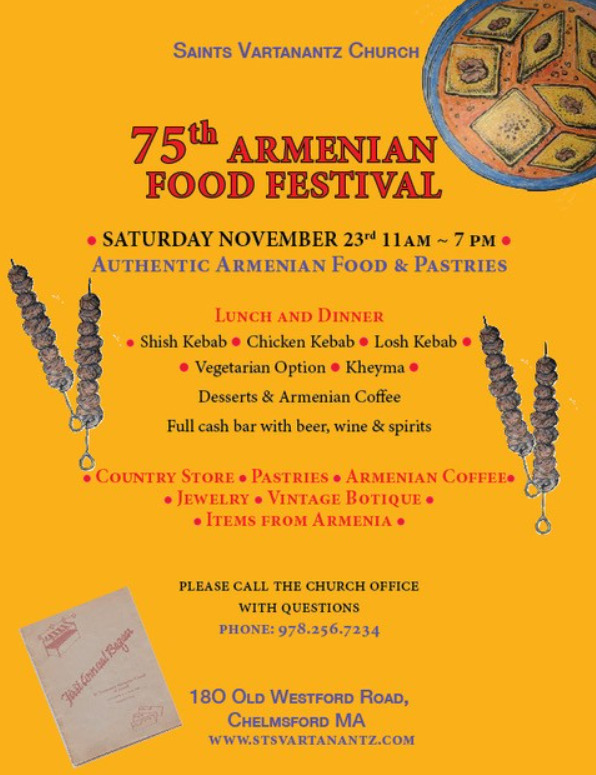 Sts. Vartanantz Church of Chelmsford, MA, will hold its 75th annual Food Festival on Saturday, Nov. 23, 11 a.m. – 7 p.m., at the church (180 Old Westford Rd., Chelmsford). Eat-in or Take-out. The Food Festival menu includes Armenian specialities; a country store; jewelry table, antique treasures boutique, gift items from Armenia, tours of the church sanctuary, and a Tavloo Tournament (click here for details). For information, call the office at (978) 256-7234. Click on the link to view a flyer.