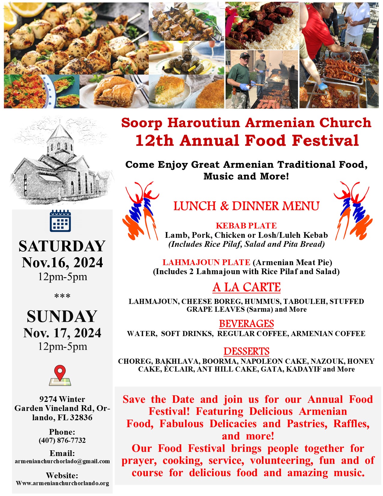 Soorp Haroutiun Church of Orlando, FL, will hold its 12th annual Food Festival on Saturday and Sunday, Nov. 16-17, 12 noon-5 p.m. each day, at the church facility (9274 Winter Garden Vineland Rd., Orlando). Armenian food, music, vendors. For information, click on the links to access the parish Facebook page, and to view a flyer.