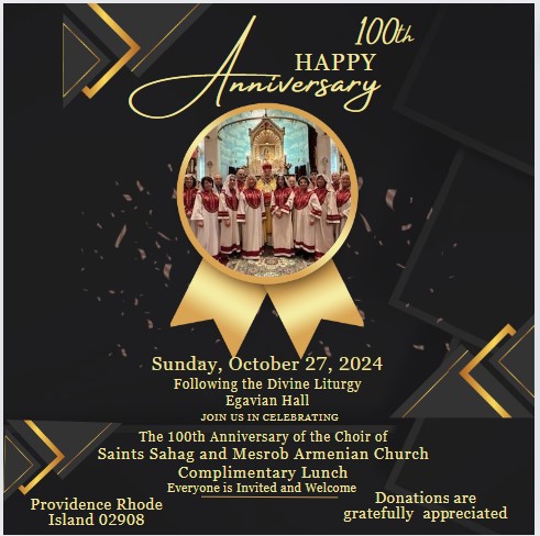 Sts. Sahag & Mesrob Church of Providence, RI, will celebrate the 100th anniversary of the church choir on Sunday, Oct. 27, during a special gathering following badarak, in the church’s Egavian Cultural Center (70 Jefferson St., Providence). All are welcome; click the link to view a flyer.