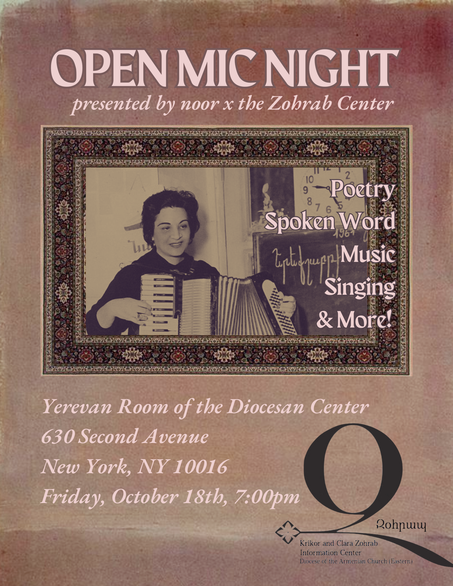 The Eastern Diocese’s Krikor and Clara Zohrab Information Center will host an “Open Mic Night” on Friday, Oct. 18, at 7 p.m. ET, in Yerevan Room of the Diocesan Center (630 Second Ave., New York City). The evening will go forward in collaboration with Noor magazine, a new literary forum & publishing platform founded in 2024 by Vladimir Mkrtchian and Madeline Berberian-Hutchinson. The public is invited to share original poetry, spoken word, music, singing, etc. in English or Armenian, in an “open mic” setting. Sign up at the event to reserve a slot. A $10 suggested donation will help support Noor magazine. E-mail zohrabcenter@armeniandiocese.org for details. Click here to view a flyer; learn more on the Zohrab Center website.