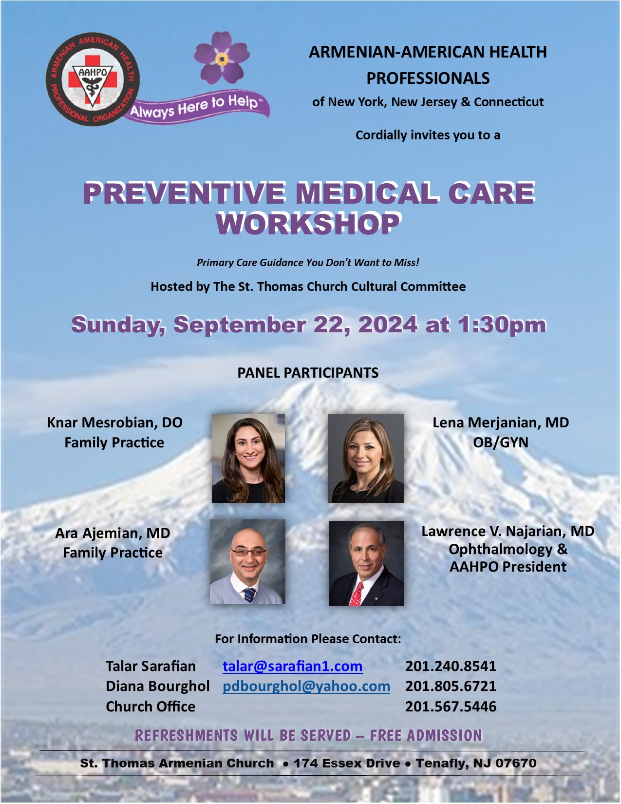St. Thomas Church of Tenafly, NJ, will host a medical workshop and panel discussion sponsored by the Armenian-America Health Professionals Organization (AAHPO), on Sunday, Sep. 22, at 1:30 p.m., at the church facility (174 Essex Dr., Tenafly). Featuring OB/GYN Dr. Lena Merjanian; family practitioners Dr. Knar Mesrobian and Dr. Ara Ajemian; ophthalmologist Dr. Larry Najarian. Refreshments. Admission is free. Click on the link to view an informative flyer.