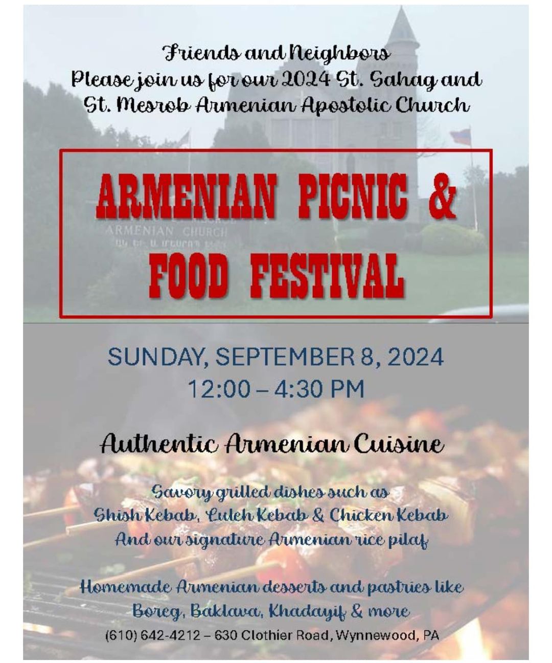 St. Sahag & St. Mesrob Church of Wynnewood, PA, will hold its annual picnic on Sunday, Sep. 8, from 12 noon to 4:30 p.m., on the church grounds (630 Clothier Rd., Wynnewood). Enjoy Armenian cuisine, live music, activities & fun for children. Rain or shine. For information call (610) 642-4212. To view a flyer, click here.