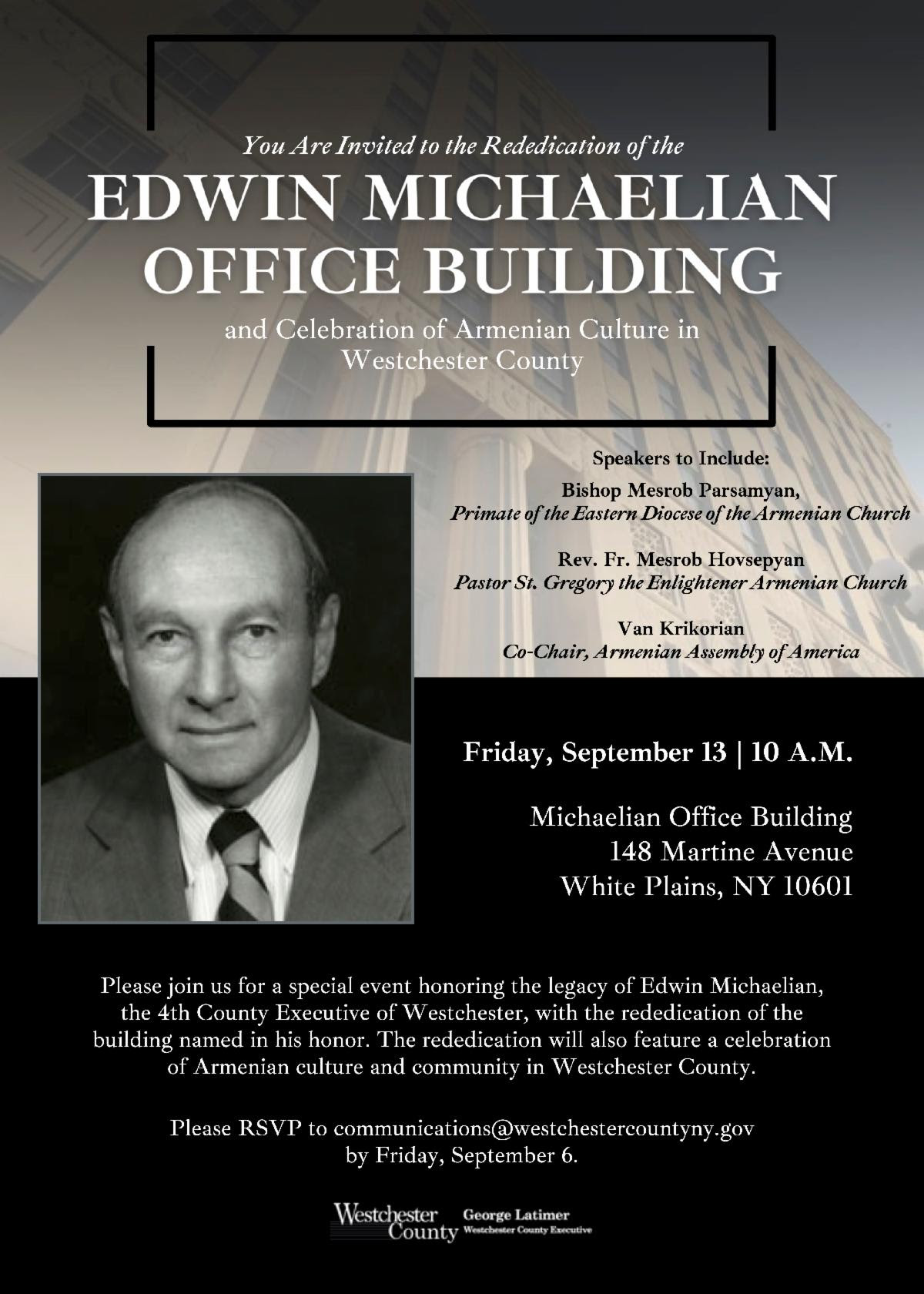 Westchester County, NY, will formally re-dedicate its “Edwin Michaelian Office Building” in a special ceremony on Friday, Sep. 13, at 10 a.m., on the premises of the building itself (148 Martine Ave., White Plains, NY). Michaelian was the 4th and longest serving Westchester County executive, whose time in office (1958-1973) coincided with the critical post-war boom, and brought him into contact with such figures as President Eisenhower (seen here) and then-Vice President Nixon. The building dedicated in his name was built 40 years ago, following Edwin’s death. Its re-dedication on Sep. 13 will coincide with a celebration of Armenian culture, contribution, and community in Westchester County. Diocesan Primate Bishop Mesrop Parsamyan will be among the dignitaries speaking at the gathering. To view a flyer, click here.