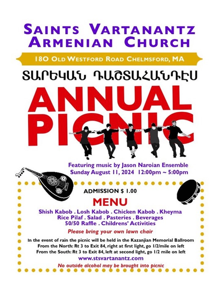 Sts. Vartanantz Church of Chelmsford, MA, will hold its annual picnic on Sunday, Aug. 11, 12-5 p.m., at the church (180 Old Westford Rd., Chelmsford). Armenian food & pastries; children’s activities; live music & dancing featuring the Jason Naroian Ensemble. In the event of rain, picnic will be in the Kazanjian Memorial Ballroom. Click on the link to view a flyer.