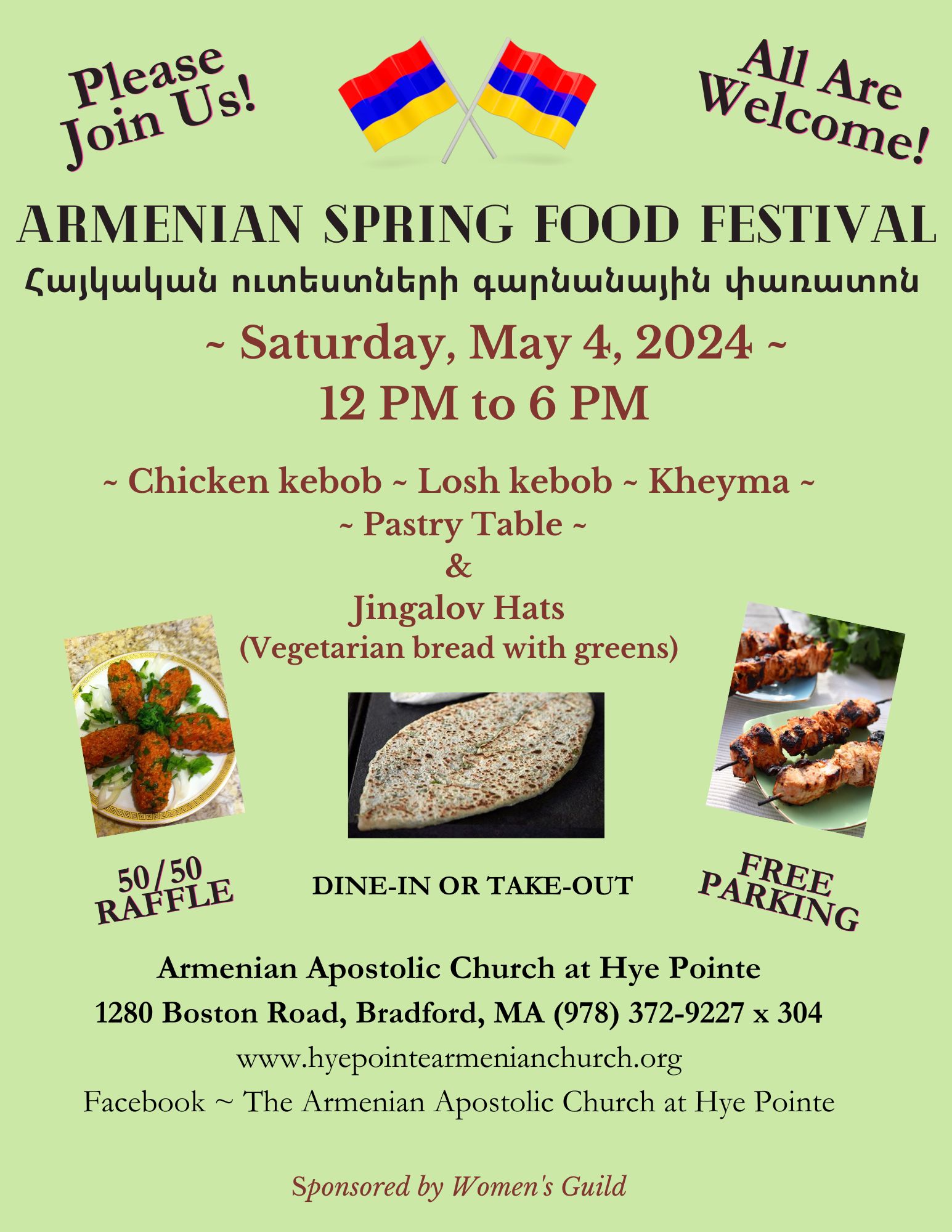 Hye Pointe Church of Haverhill, MA, will hold its Armenian Spring Food Festival on Saturday, May 4, 12-6 p.m., at the church facility (1280 Boston Rd., Haverhill). Live music, Armenian delicacies. For information call (978) 372-9227, or visit the parish website. To view a flyer, click here.