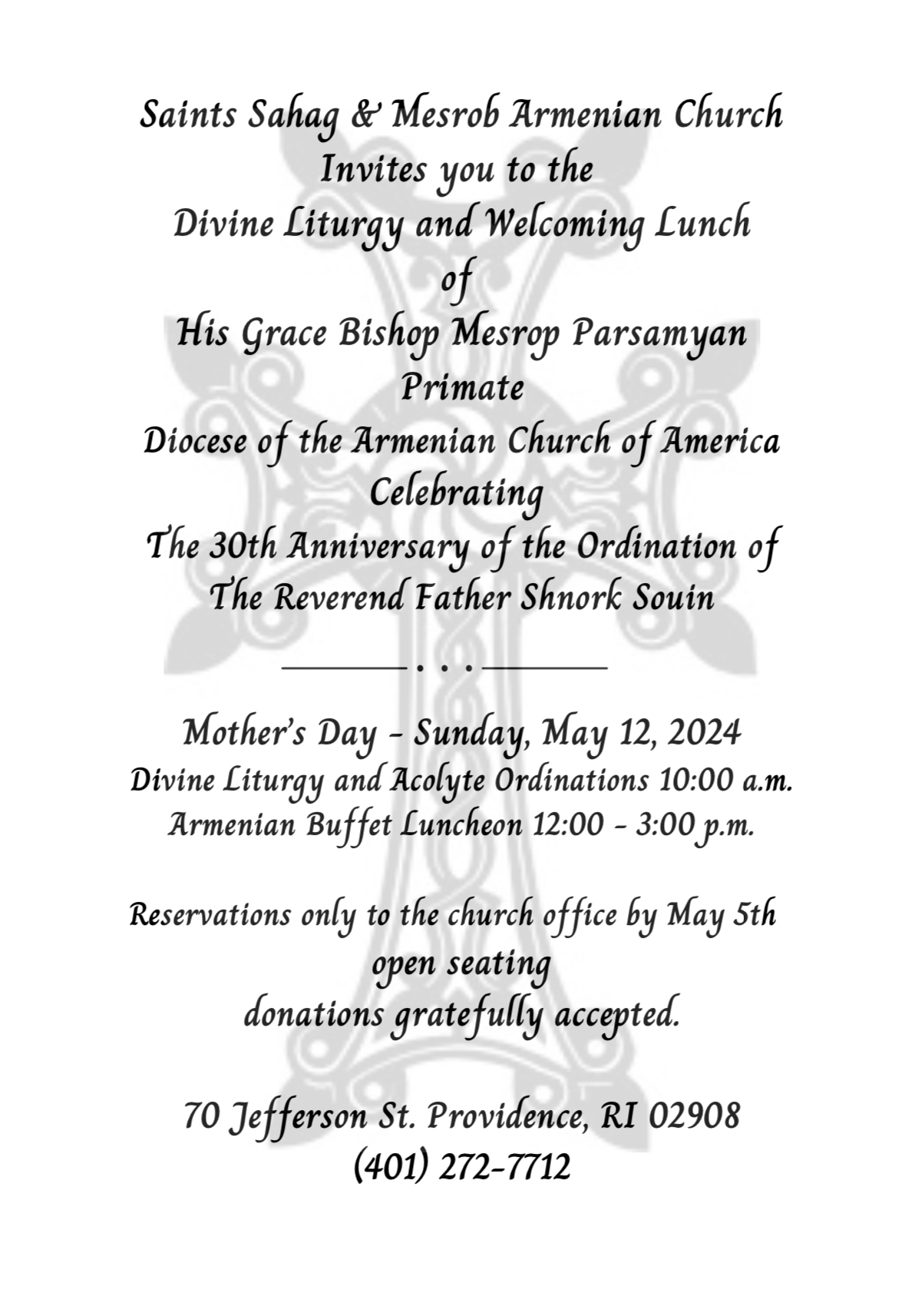 Sts. Sahag & Mesrob Church of Providence, RI, will celebrate the 30th ordination anniversary of its pastor, Fr. Shnork Souin, on Sunday, May 12 (Mother’s Day), following badarak, at the church (70 Jefferson St., Providence). Diocesan Primate Bishop Mesrop Parsamyan will preside. Luncheon at 12 noon. RSVP (by May 5) to (401) 272-7712. Click the link to view a flyer.