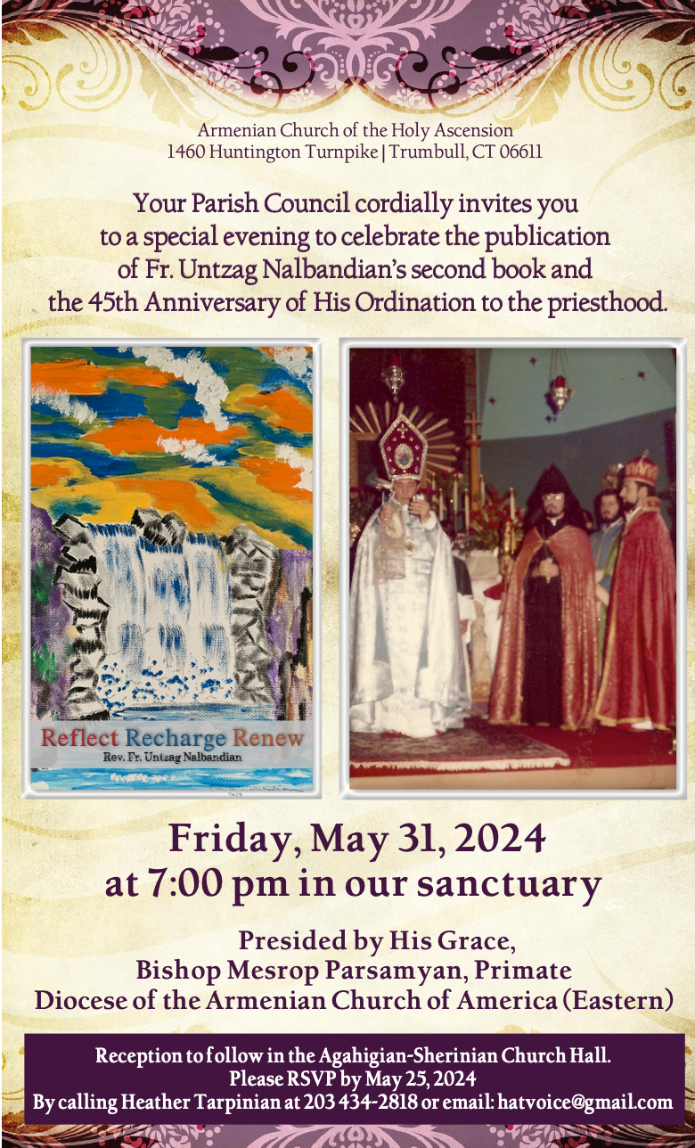 Holy Ascension Church of Trumbull, CT, will host a book presentation on Friday, May 31, at 7 p.m., in the church sanctuary (1460 Huntington Trnpk., Trumbull). Diocesan Primate Bishop Mesrop Parsamyan will preside, as parish pastor Fr. Untzag Nalbandian presents his latest book, Reflect, Recharge, Renew, marking his 45th ordination anniversary. Reception to follow. All are invited; RSVP (by May 25) to Heather Tarpinian at (203) 434-2818, or hatvoice@gmail.com. To view a flyer, click here.