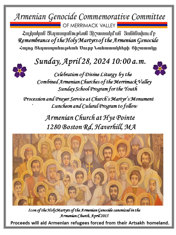 The Armenian Churches of the Merrimack Valley will hold a Remembrance of the Holy Martyrs of the Armenian Genocide, on Sunday, Apr. 28, at Hye Pointe Church (1280 Boston Rd., Haverhill, MA). Service begins at 10 a.m.; special Sunday School program for the youth. Reception and youth cultural program to follow. Click here to view a flyer.