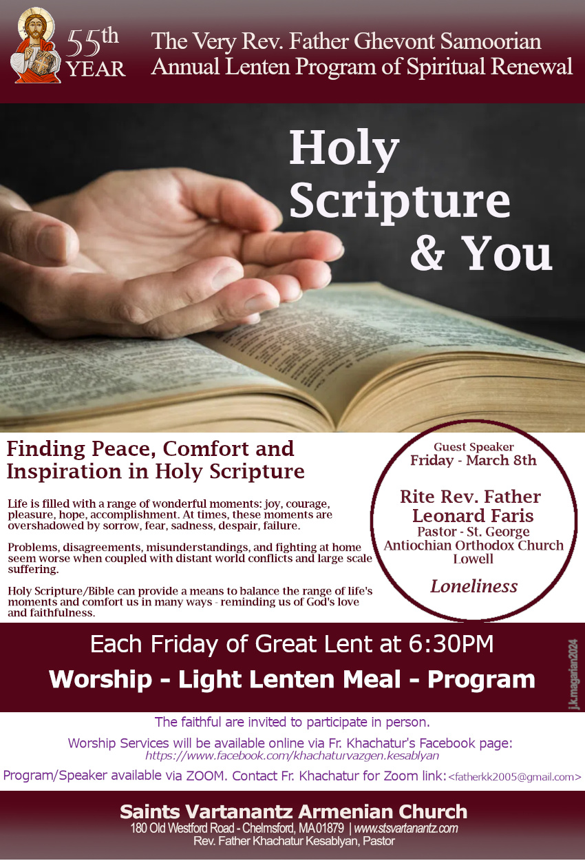 Sts. Vartanantz Church of Chelmsford, MA, will host its 55th season of Lenten programs—the “Fr. Ghevont Samoorian Lenten Program of Spiritual Renewal”—as in-person lectures on Friday evenings at 6:30 p.m. through Lent (Mar. 1, 8, 15, 22) at the church (180 Old Westford Rd., Chelmsford). This year’s theme will explore “Holy Scripture and You”; each session includes worship service (with online broadcast; see flyer), light dinner, lecture. For topics, speakers, and details, click on the links to view a flyer and log onto the parish website.