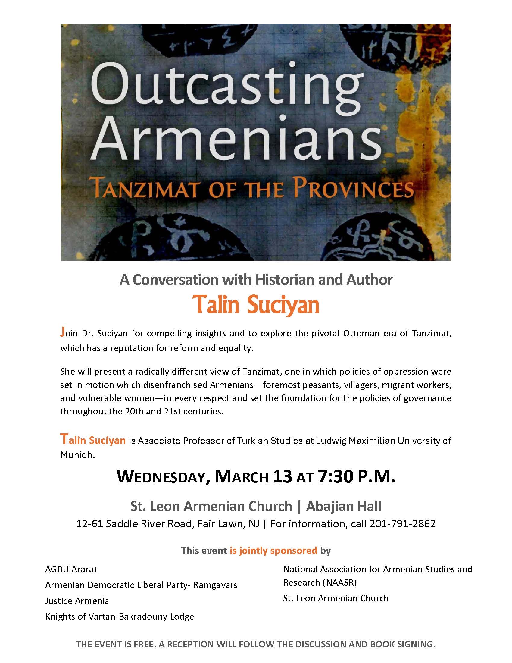 St. Leon Church (Fair Lawn, NJ) will host an in-person lecture on Wednesday, Mar. 13, at 7:30 p.m., at the church’s Abajian Hall (12-61 Saddle River Rd., Fair Lawn). Prof. Talin Suciyan of Munich, Germany, will discuss her book, Outcasting Armenians: Tanzimat of the Provinces. A reception and book-signing will follow. Click the following link to view a flyer with info. For questions call (201) 592-2162.