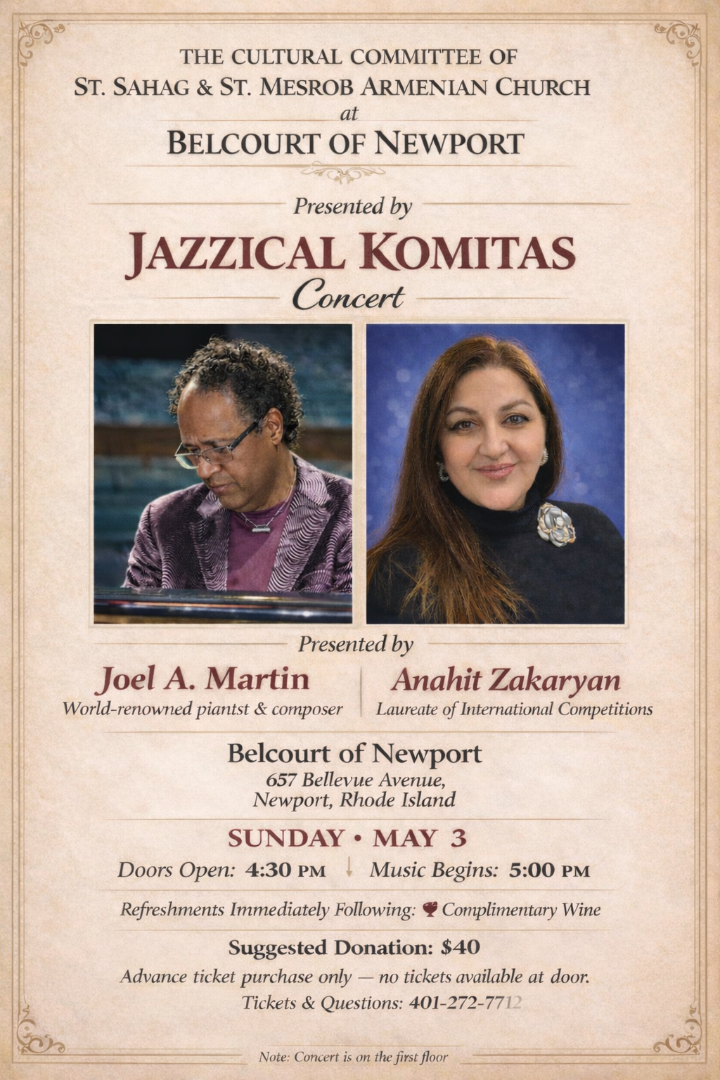 The Cultural Committee of Sts. Sahag & Mesrob Church of Providence, RI, will present “Jazzical Komitas,” a concert featuring jazz pianist Joel Martin and guest vocalist Anahit Zakaryan, on Sunday, May 3, at 5 p.m., in Belcourt of Newport (657 Bellevue Ave., Newport, RI). Refreshments following. Seating is limited, and advance ticket purchases only (no tickets at door). For ticket and other details, click the link to view a flyer.