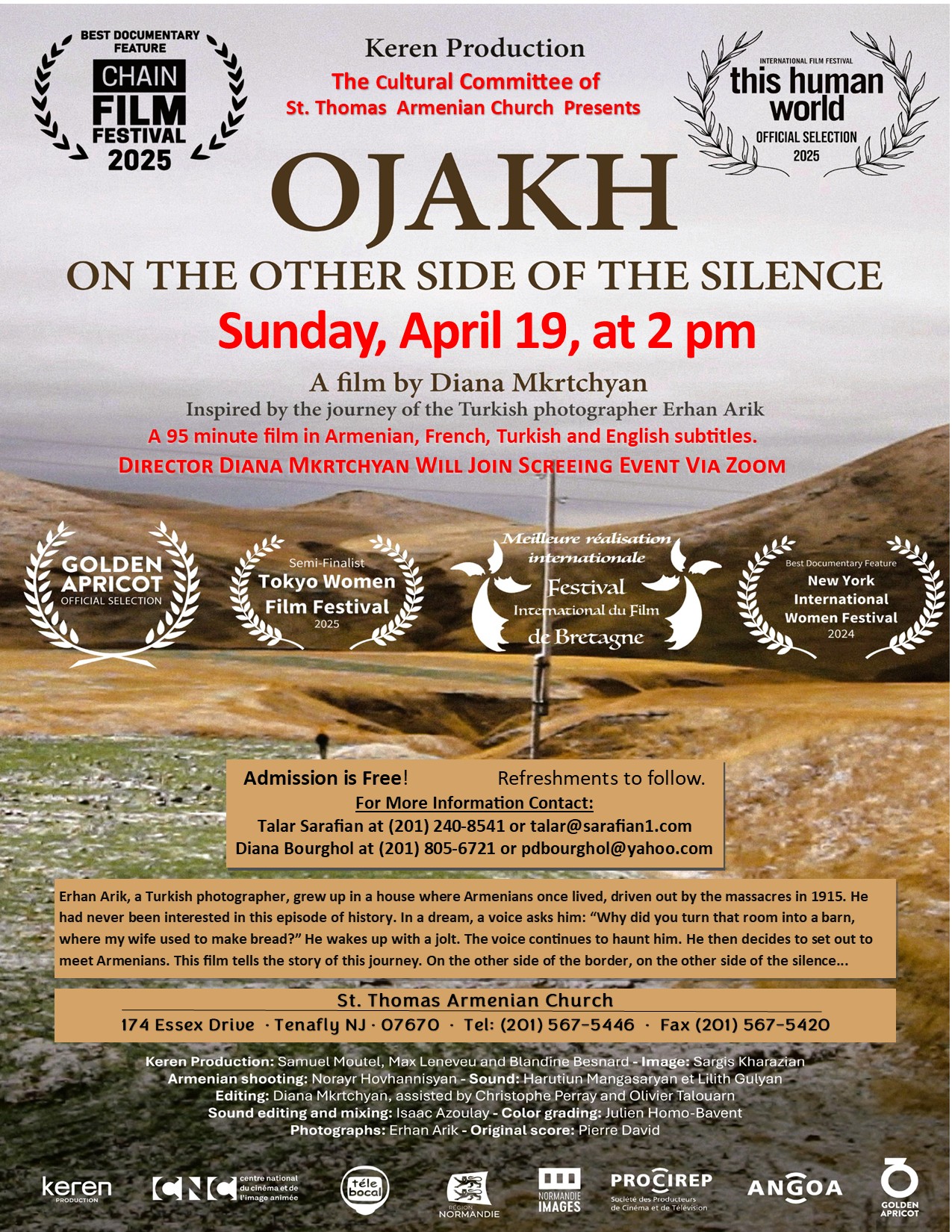 The Cultural Committee of St. Thomas Church in Tenafly, NJ, will screen the film Ojakh: On the Other Side of the Silence, on Sunday, Apr. 19, at 2 p.m. at the church (174 Essex Dr., Tenafly). The film by Diana Mkrtchyan, inspired by the journey of photographer Erhan Arik, is in Armenian, French, Turkish, with English subtitles. Director Mkrtchyan will join screening via Zoom. Admission is free; reception to follow. For information, e-mail talar@sarafian1.