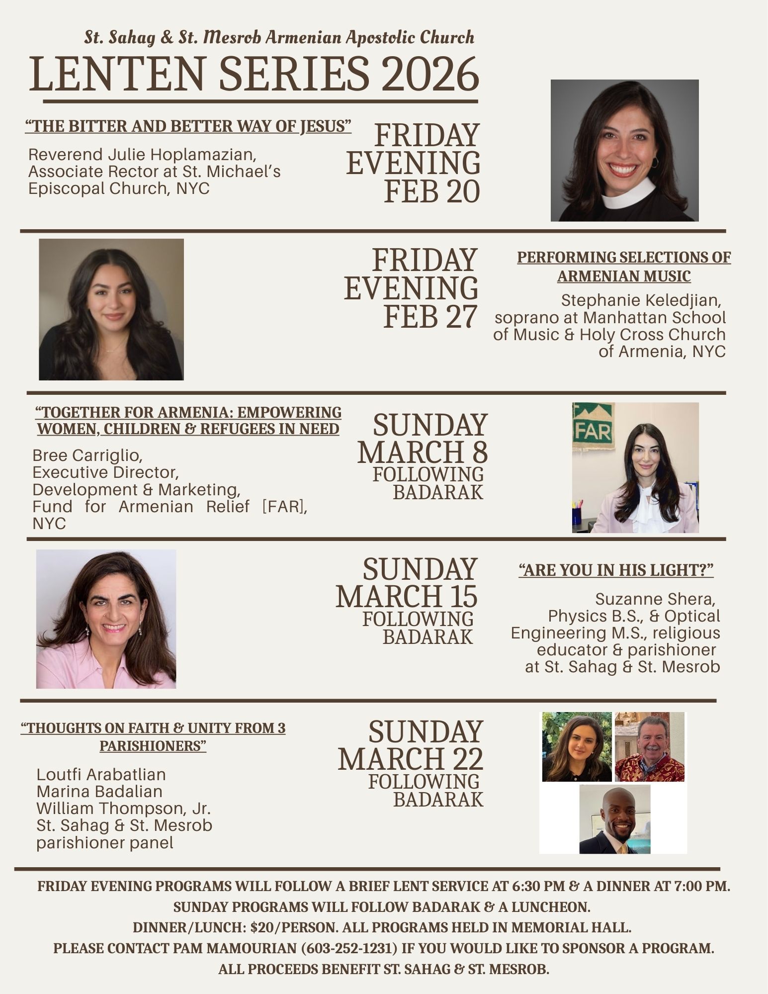 St. Sahag & St. Mesrob Church (Wynnewood, PA) is holding a Sunday afternoon lecture series through the season of Great Lent, at the church (630 Clothier Rd., Wynnewood). Following badarak on Sundays of Lent (Mar. 8, 15, 22) the church will hold a luncheon and lecture. For Mar. 8 the speaker is Bree Carriglio of the fund for Armenian Relief. The parish is also holding Friday evening worship and dinners through Lent. For details on the Friday services, and the roster of Sunday speakers, click the following link to view a flyer. Call the church at (610) 642-4212 or information.
