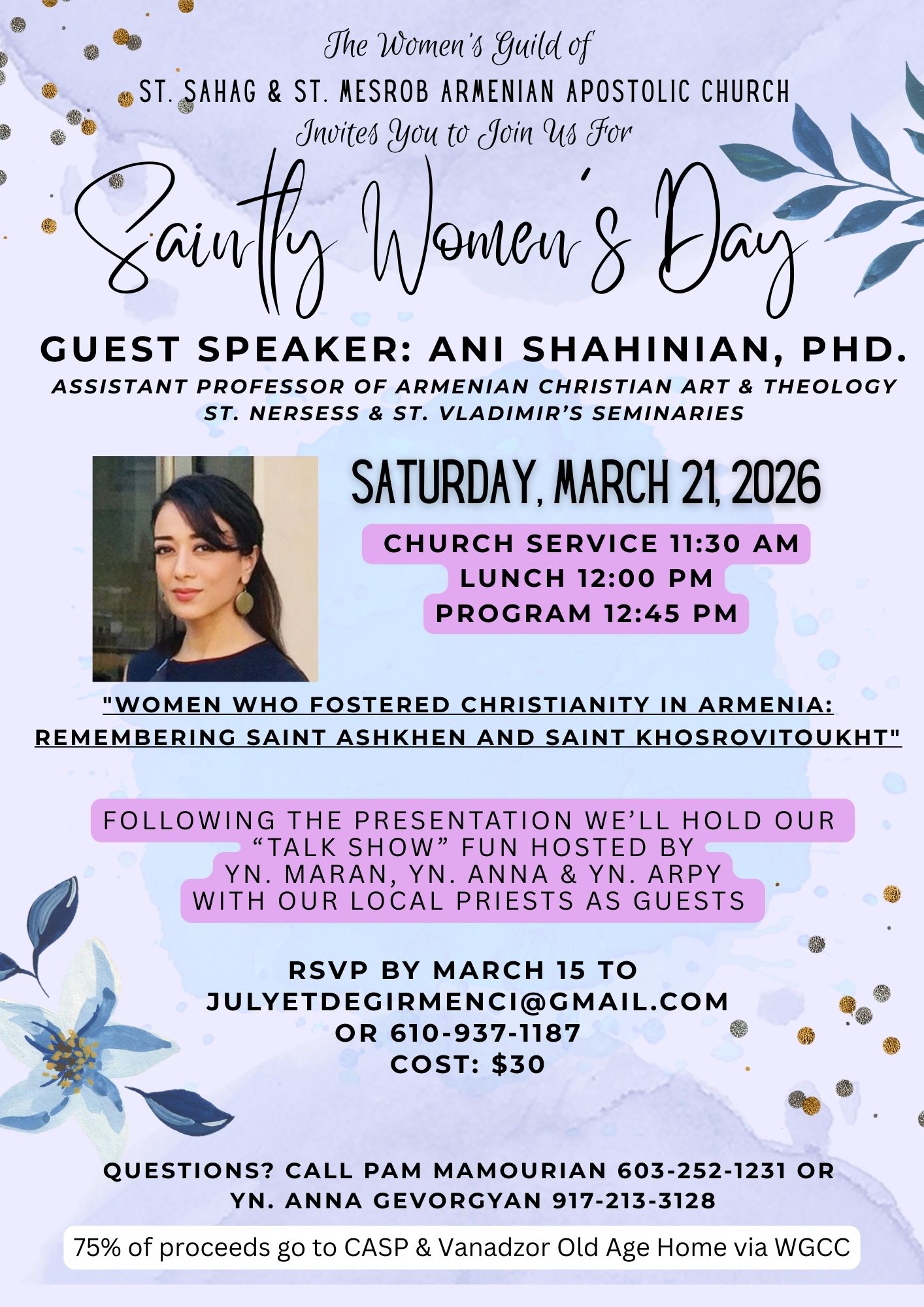 St. Sahag & St. Mesrob Church of Wynnewood, PA, will hold a “Saintly Women’s Day” program on Saturday, Mar. 21, starting at 11:30 a.m., at the church (630 Clothier Rd., Wynnewood). The program includes a morning service, luncheon and speaker Dr. Ani Shahinian of St. Nersess Seminary. For information, click the link to view a flyer, or call the church at (610) 642-4212.