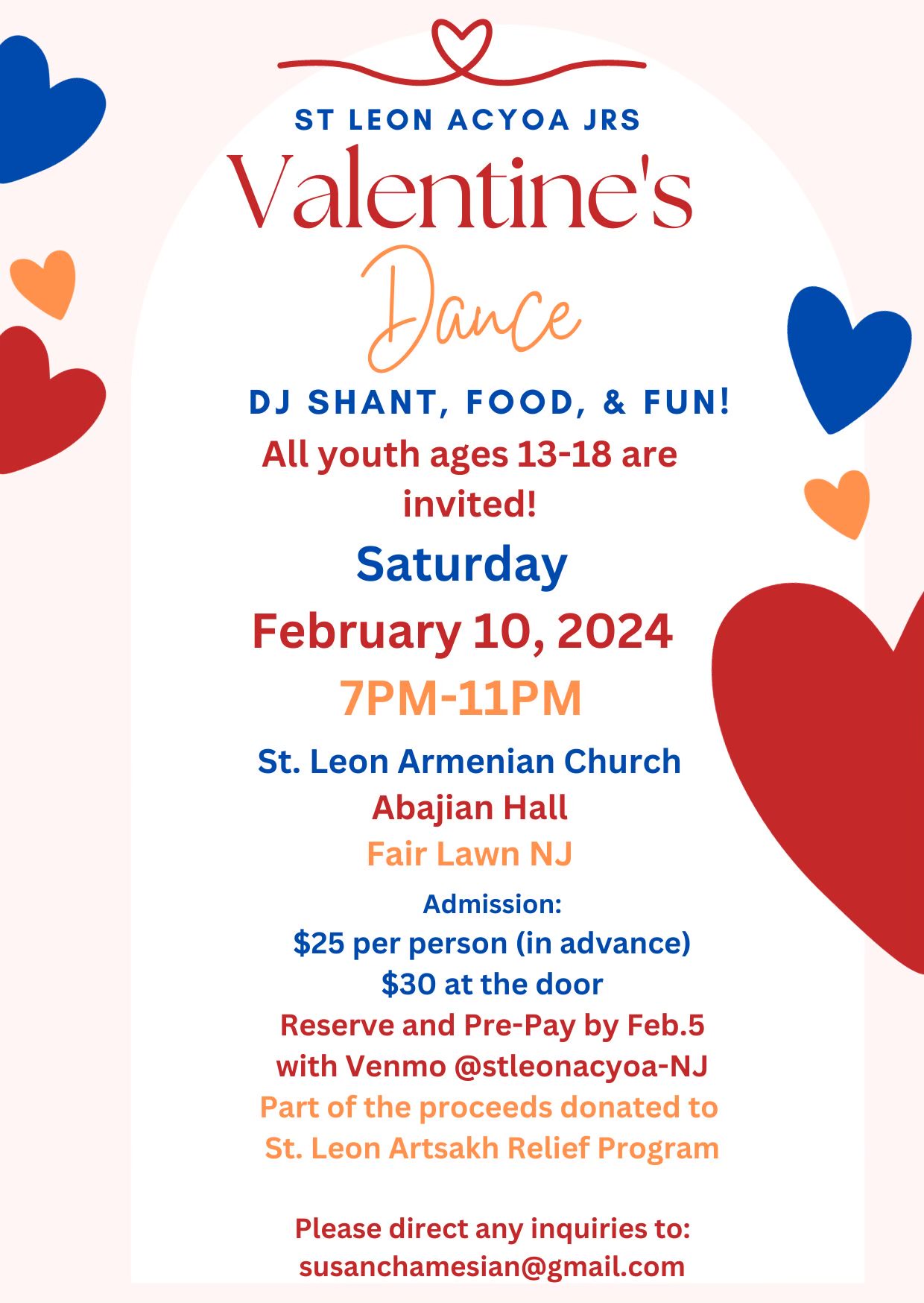The ACYOA Juniors of St. Leon Church (Fair Lawn, NJ) will host a Valentine’s Dance on Saturday, Feb. 10, 7-11 p.m., at the parish’s Abajian Hall (12-61 Saddle River Rd., Fair Lawn). Music by DJ Shant; food; open to all ACYOA Juniors. Advance reservations (by Feb. 5) via Venmo or check will receive a discount over tickets purchased at the door (mail checks payable to “St. Leon ACYOA Jrs.” to Aram Chamesian, 694 William Bliss Dr., New Milford, NJ 07646). Contact Susan Chamesian at susanchamesian@gmail.com for information. Click here to view a flyer with details on advance ticket sales.