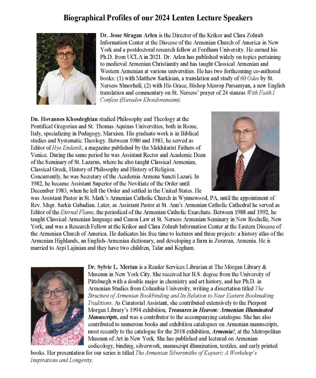 Sts. Vartanantz Church of Chelmsford, MA, will host its 55th season of Lenten programs—the “Fr. Ghevont Samoorian Lenten Program of Spiritual Renewal”—as in-person lectures on Friday evenings at 6:30 p.m. through Lent (Feb. 16, 23, Mar. 1, 8, 15, 22) at the church (180 Old Westford Rd., Chelmsford). This year’s theme will explore “Holy Scripture and You”; each session includes worship service (with online broadcast; see flyer), light dinner, lecture. For topics, speakers, and details, click on the links to view a flyer and log onto the parish website.