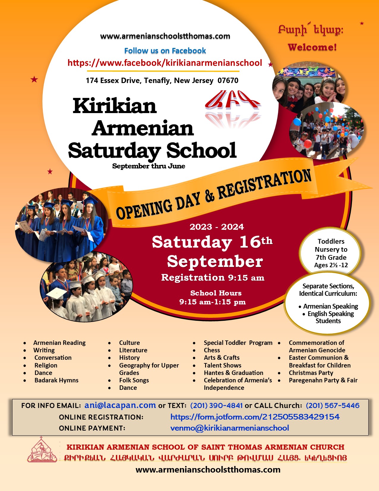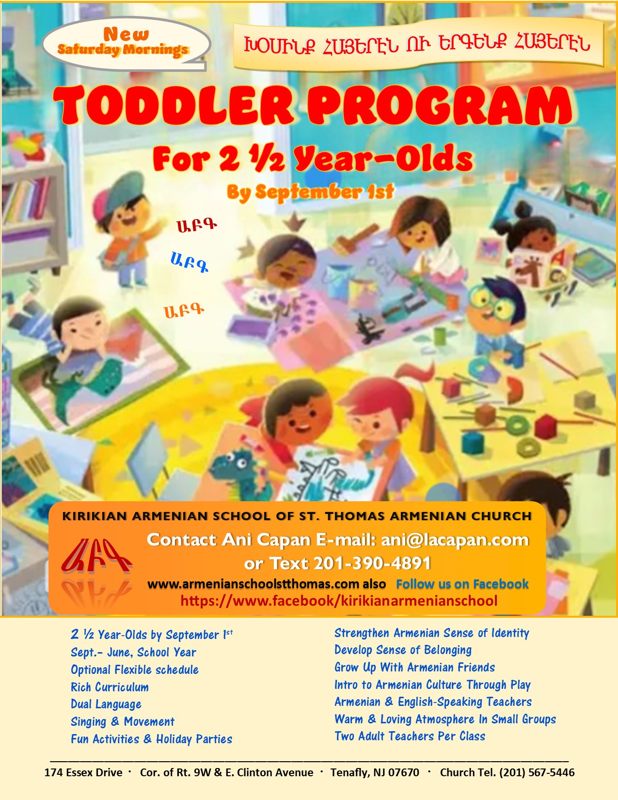 The Kirikian Armenian School of St. Thomas Church of Tenafly, NJ, will begin the academic year on Saturday, Sep. 16, starting at 9:15 a.m. Classes are aimed at toddler, pre-K, and kindergarten through grade 7 levels, with offerings in Armenian reading, writing, conversation, culture, dance, song, religion and sacred musicFor information e-mail ani@lacapan.com or call (201) 567-5446; to view a flyer click here. To register, log onto the online registration form, or see the school Facebook page.