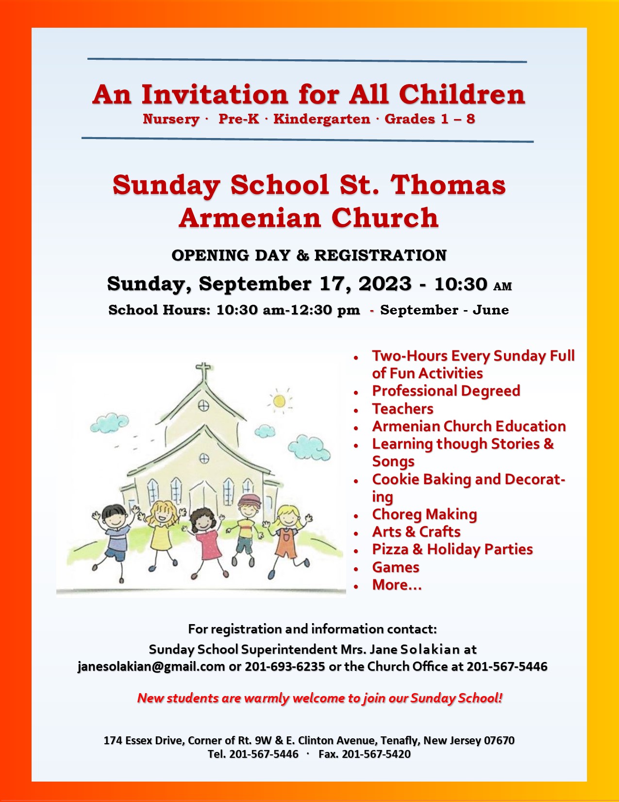 The Sunday School of St. Thomas Church of Tenafly, NJ, will begin the academic year on Sunday, Sep. 17, starting at 10:30 a.m. Classes are aimed at nursery, pre-K, and kindergarten through grade 8 levelsFor information e-mail janesolakian@gmail.com or call (201) 567-5446; to view a flyer click here.