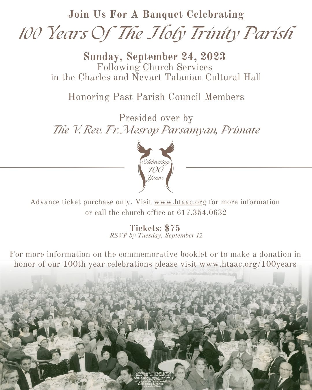 Holy Trinity Church of Cambridge, MA, will mark its 100th anniversary on Sunday, Sep. 24, with a banquet directly after badarak, in the church’s Charles and Nevart Talanian Hall (145 Brattle St., Cambridge). Diocesan Primate Fr. Mesrop Parsamyan will preside over the Diamond Anniversary Banquet, honoring all of Holy Trinity’s past Parish Council members. Click the following links to purchase tickets and view a flyer.