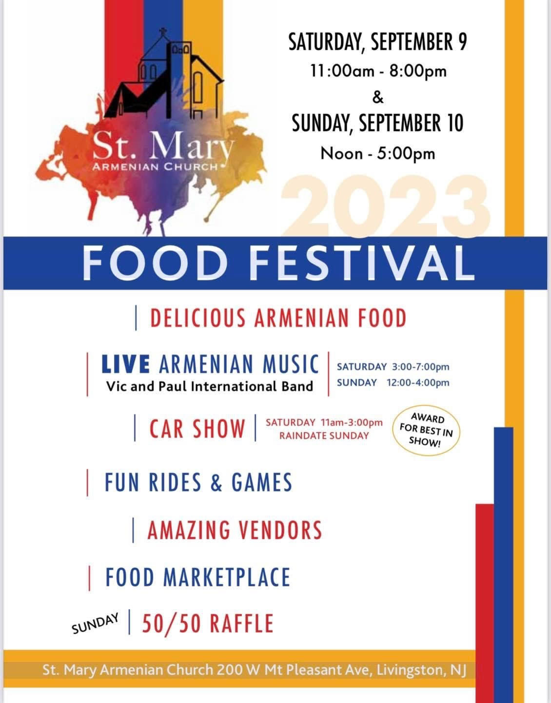 St. Mary Church of Livingston, NJ, will hold its annual two-day Armenian Food Festival on Saturday, Sep. 9 (11 a.m.-8 p.m.) and Sunday, Sep. 10 (12 noon-5 p.m.), on the church grounds (200 W. Mt. Pleasant Ave., Livingston, NJ). Traditional Armenian foods, Armenian vendors, live Armenian music, 50/50 raffle, and lots of children’s activities. Rain or shine. For information, call the church at (973) 533-9794. Visit the parish website and the parish Facebook page for information. Click the link to view a flyer.