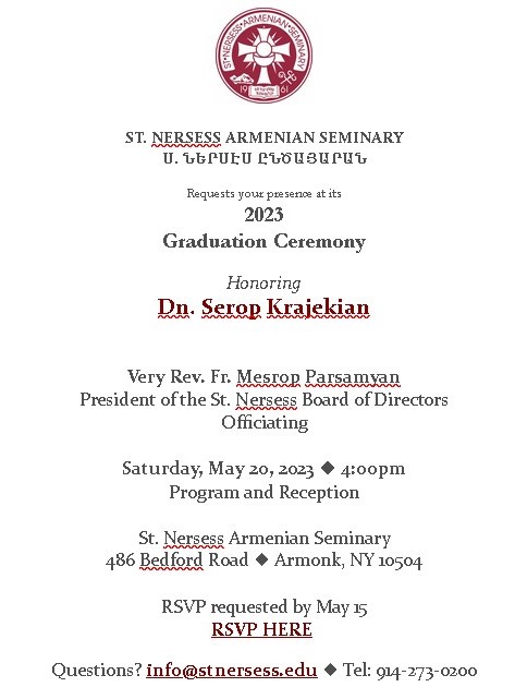 St. Nersess Armenian Seminary will hold its 2023 graduation ceremony on Saturday, May 20, at 4 p.m., in St. Hagop Chapel on the seminary campus (486 Bedford Rd., Armonk, NY). Diocesan Primate Fr. Mesrop Parsamyan will preside, as graduating seminarian Dn. Serop Krajekian is honored for completing the seminary’s program of studies. In-person event; open to the public. To RSVP (by May 16) call (914) 273-0200, or e-mail info@stnersess.edu. Find information and donation and RSVP links at www.stnersess.edu. Click the link to view an invitation.