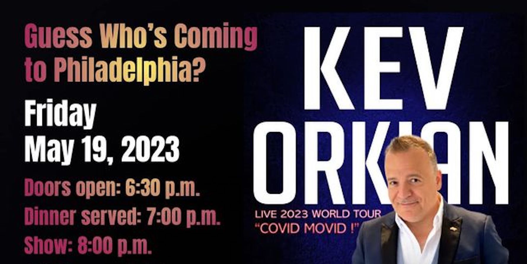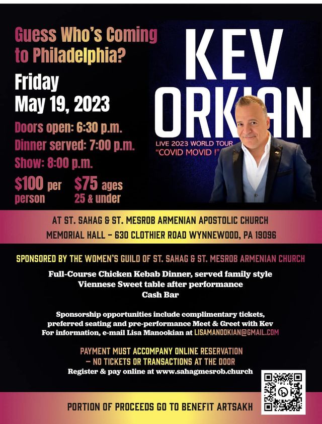 St. Sahag & St. Mesrob Church (Wynnewood, PA) will host world-renown British-Armenian comedian, Kev Orkian, on Friday, May 19, performing his show “COVID MOVID” at the church hall (630 Clothier Rd., Wynnewood). Doors open at 6:30 p.m.; dinner at 7 p.m.; show at 8 p.m. Purchase tickets online (by May 10) at www.sahagmesrob.church. Click here to view a flyer with complete information.