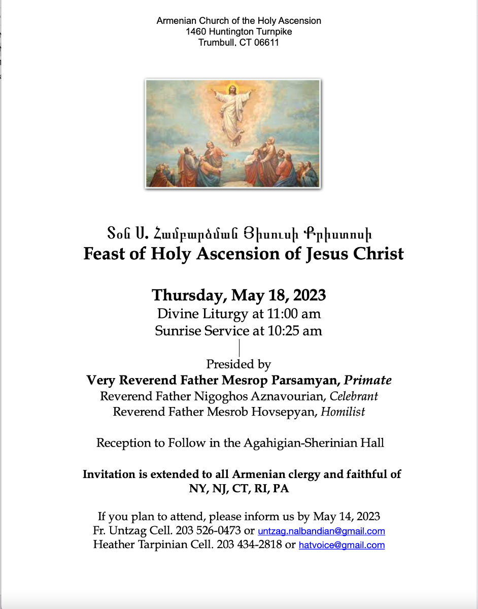 Holy Ascension Church of Trumbull, CT, will host a regional celebration of the Feast of the Holy Ascension of Jesus Christ, on Thursday, May 18, at the church (1460 Huntington Trnpk., Trumbull). Diocesan Primate Fr. Mesrop Parsamyan will preside over the service, which begins with a sunrise service at 10:25 a.m., and continues with the Divine Liturgy at 11 a.m. EDT. Fr. Nigoghos Aznavourian will be the celebrant, and Fr. Mesrob Hovsepyan the preacher of the day. Diocesan clergy of the NY, NJ, CT, RI communities will participate, hosted by parish pastor Fr. Untzag Nalbandian. Click the following link to watch the service broadcast on the parish Facebook page.