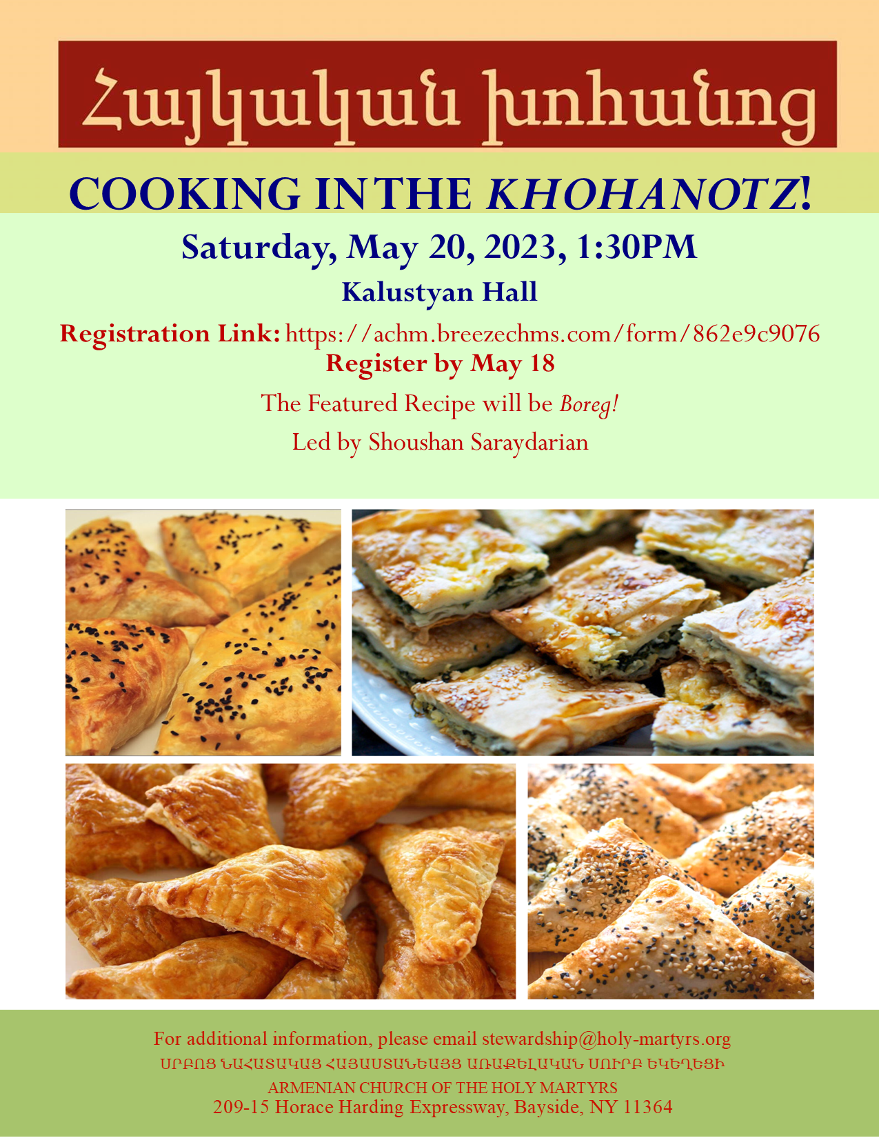 Holy Martyrs Church of Bayside, NY, will hold its latest instructional session of “Cooking in the Khohanotz” on Saturday, May 20, at 1:30 p.m. in the church’s Kalustyan Hall (20915 Horace Harding Expy., Bayside). Shoushan Saraydarian will lead the lesson in preparing various varieties of Boreg. Click here to register by May 18. To view a flyer with information, click here.