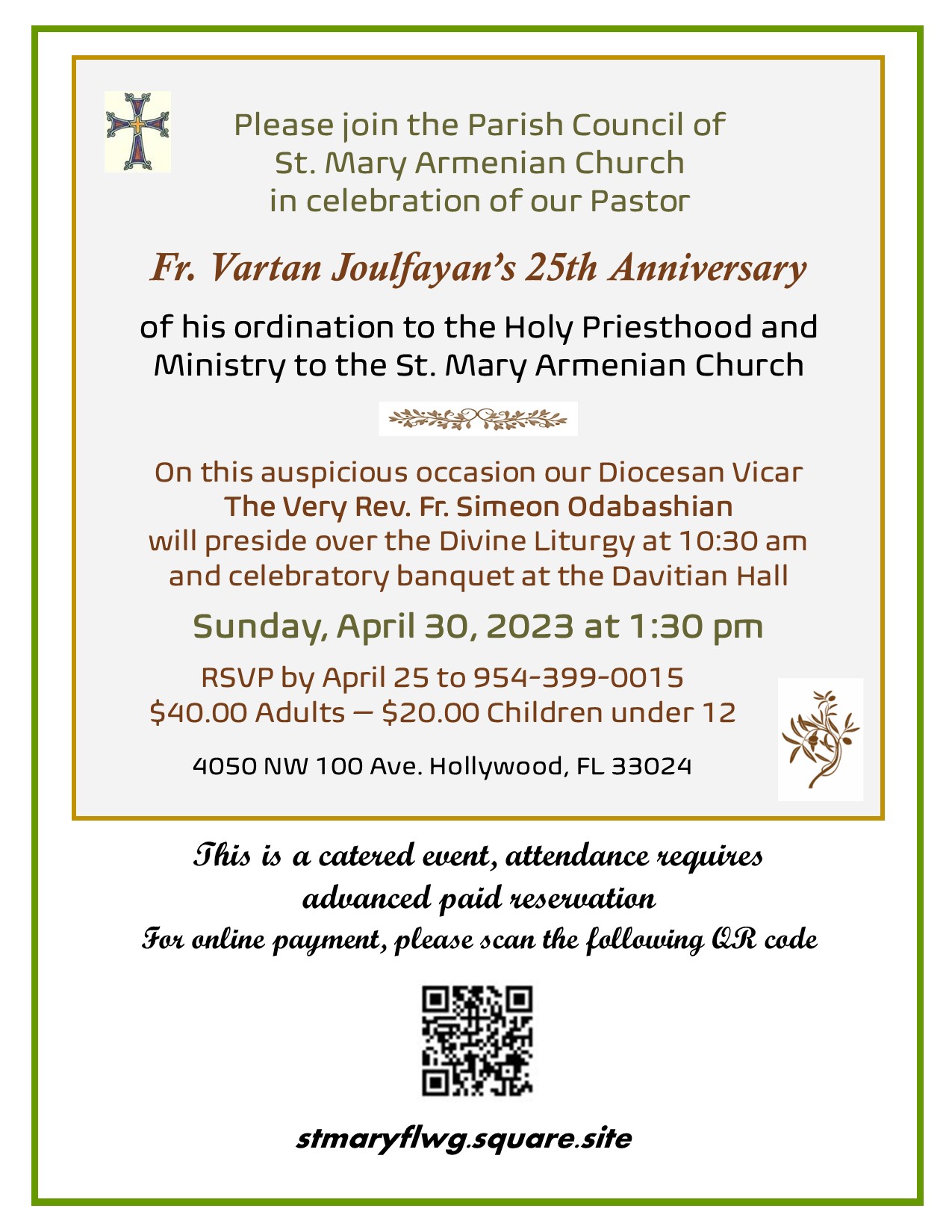 St. Mary Church of Hollywood, FL, will celebrate the 25th ordination anniversary of its longtime pastor, Fr. Vartan Joulfayan, on Sunday, Apr. 30, at the church facility (4050 NW 100th Ave., Cooper City). Divine Liturgy at 10:30 a.m., Diocesan Vicar Fr. Simeon Odabashian presiding. Banquet at 1:30 p.m. in Davitian Hall. Reservations required; to reserve and for information, click the link to view a flyer.