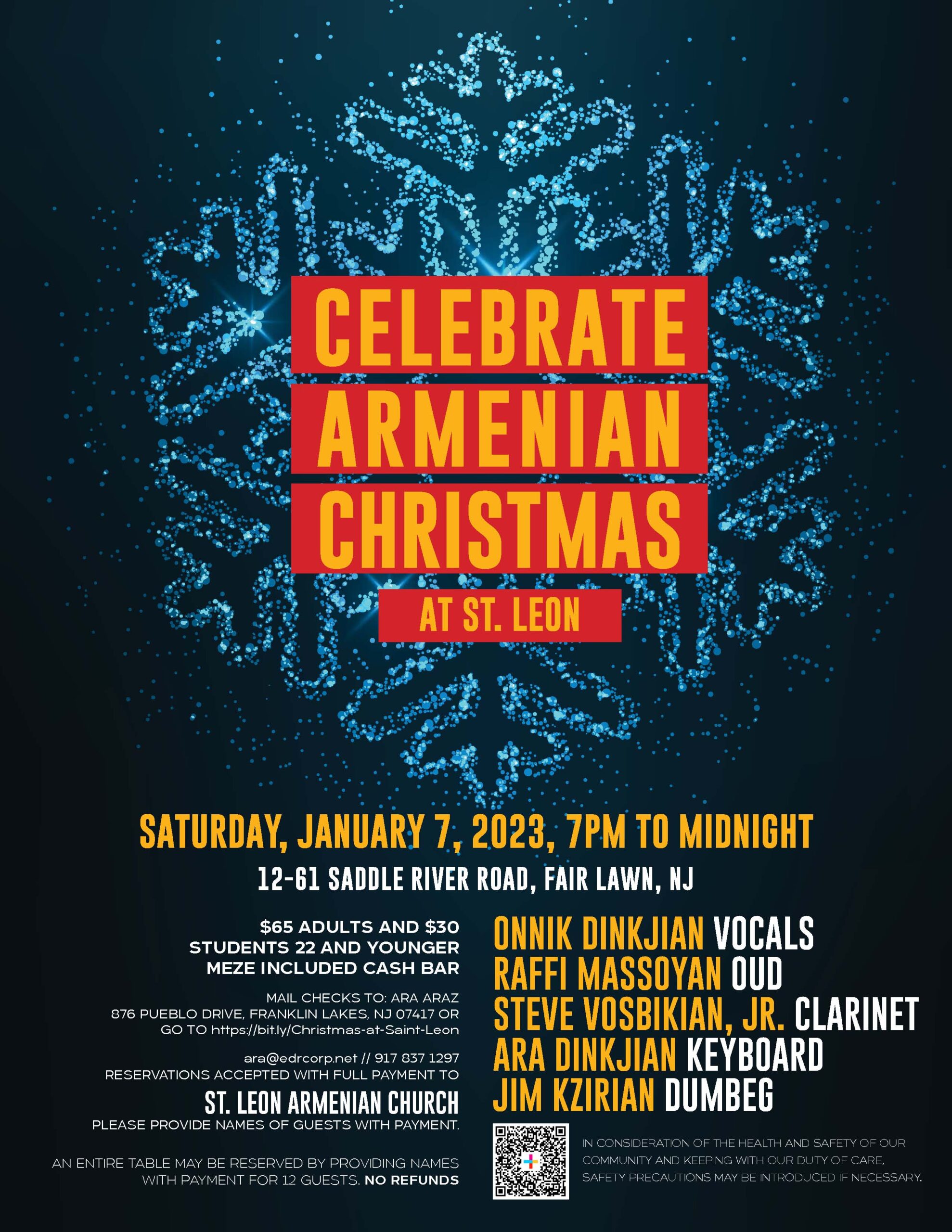 St. Leon Church of Fair Lawn, NJ, will hold its annual “Armenian Christmas Dance” on Saturday, Jan. 7, 2023, 7 p.m. to midnight, at the church (12-61 Saddle River Rd., Fair Lawn). For details, reservation and ticket information, click on the link to view a flyer.