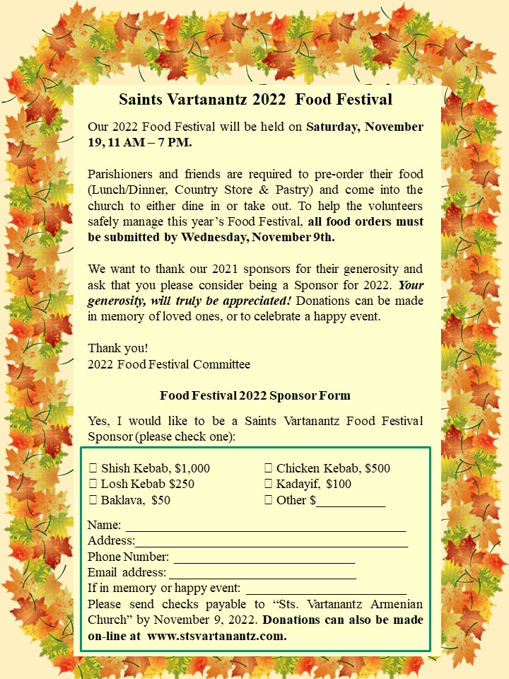Sts. Vartanantz Church of Chelmsford, MA, will hold its annual Food Festival on Saturday, Nov. 19, 12 noon-7 p.m., at the church (180 Old Westford Rd., Chelmsford). Eat-in or take-out, but all lunches and dinners, along with Country Store items, must be pre-ordered by Wednesday, Nov. 9. The menu includes Armenian favorites; click the following links to learn more on the parish website, and to view/download the Food Festival flyer, food order form, and sponsorship form.