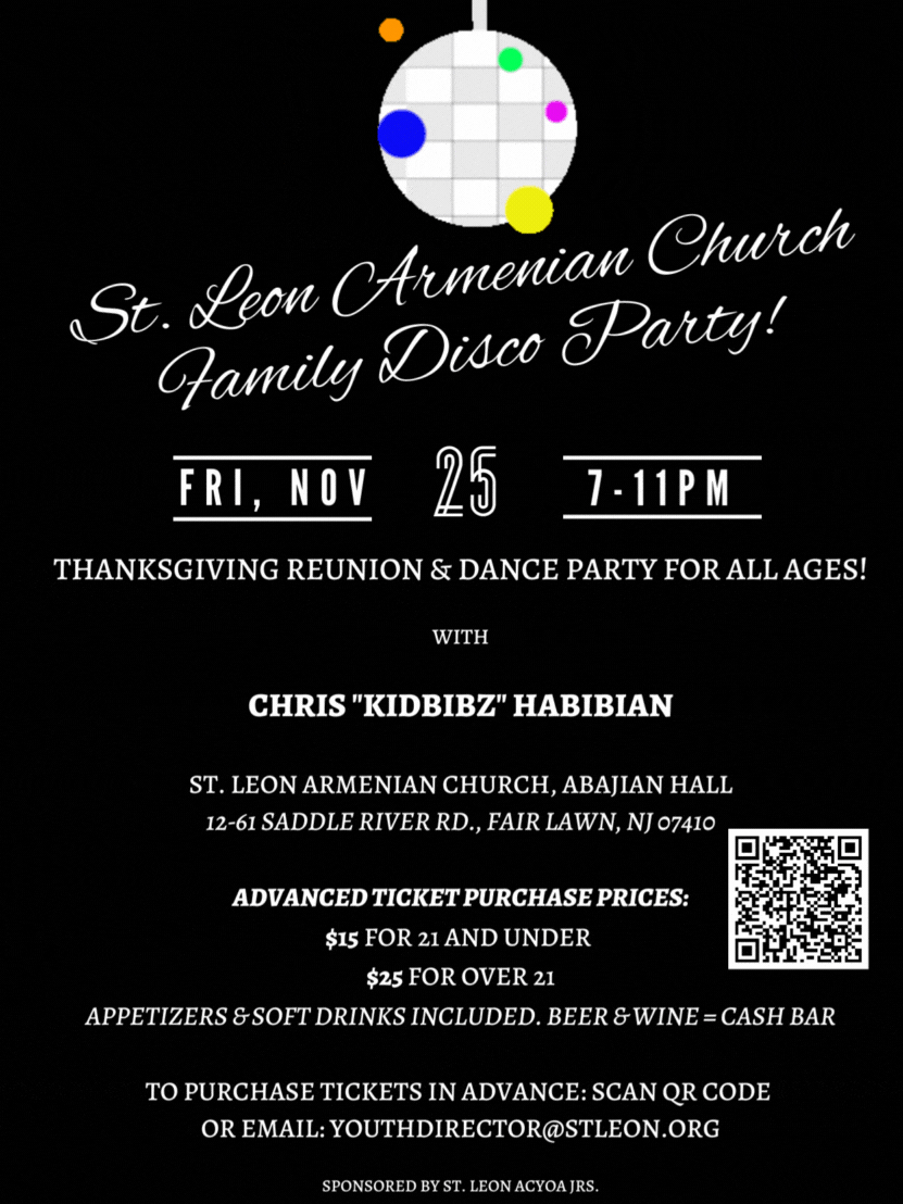 St. Leon Church in Fair Lawn, NJ, will hold a “Family Disco Party,” on Friday, Nov. 25, at 7 p.m., at the church’s Abajian Hall (12-61 Saddle River Rd., Fair Lawn). Click the link to view a flyer with information on tickets, reservations, and more. E-mail youthdirector@stleon.org for details, or click here to purchase tickets online.