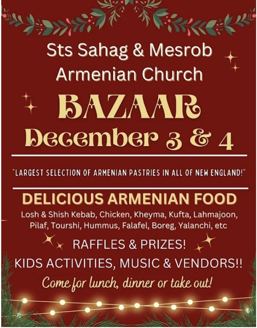 Sts. Sahag & Mesrob Church of Providence, RI, will hold its annual Bazaar and Armenian Food Fair on Saturday and Sunday, Dec. 3-4, on the church grounds (70 Jefferson St., Providence). Armenian foods & pastries; eat-in/take-out. Live music, performances, activities. Click the link to view a flyer.