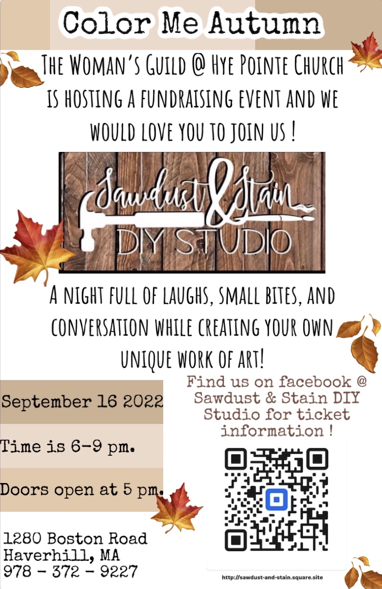 The Women’s Guild of Hye Pointe Church in Haverhill, MA, will hold a painting fundraiser on Friday, Sep.. 16, 6-9 p.m., at the church facility (1280 Boston Rd., Haverhill). Support the church while creating a unique work of art. To view a flyer, click here.