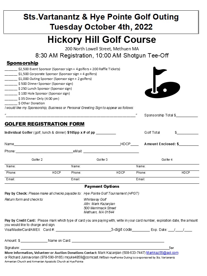 The “Sts. Vartanantz and Hye Pointe Golf Outing,” jointly sponsored by Sts. Vartanantz Church of Chelmsford, and Hye Pointe Church of Bradford, MA, will be held on Tuesday, Oct. 4, at Hickory Hills Golf Course in Methuen, MA. Registration at 8:30 a.m.; shotgun start at 10 a.m. Golfers of all skill levels welcome. Awards dinner follows at golf course restaurant. For information e-mail Markkaz55@aol.com or mrjuke4859@comcast.net. Proceeds to benefit various church ministries. Click the link to a view a flyer with event information and registration/sponsorship details.