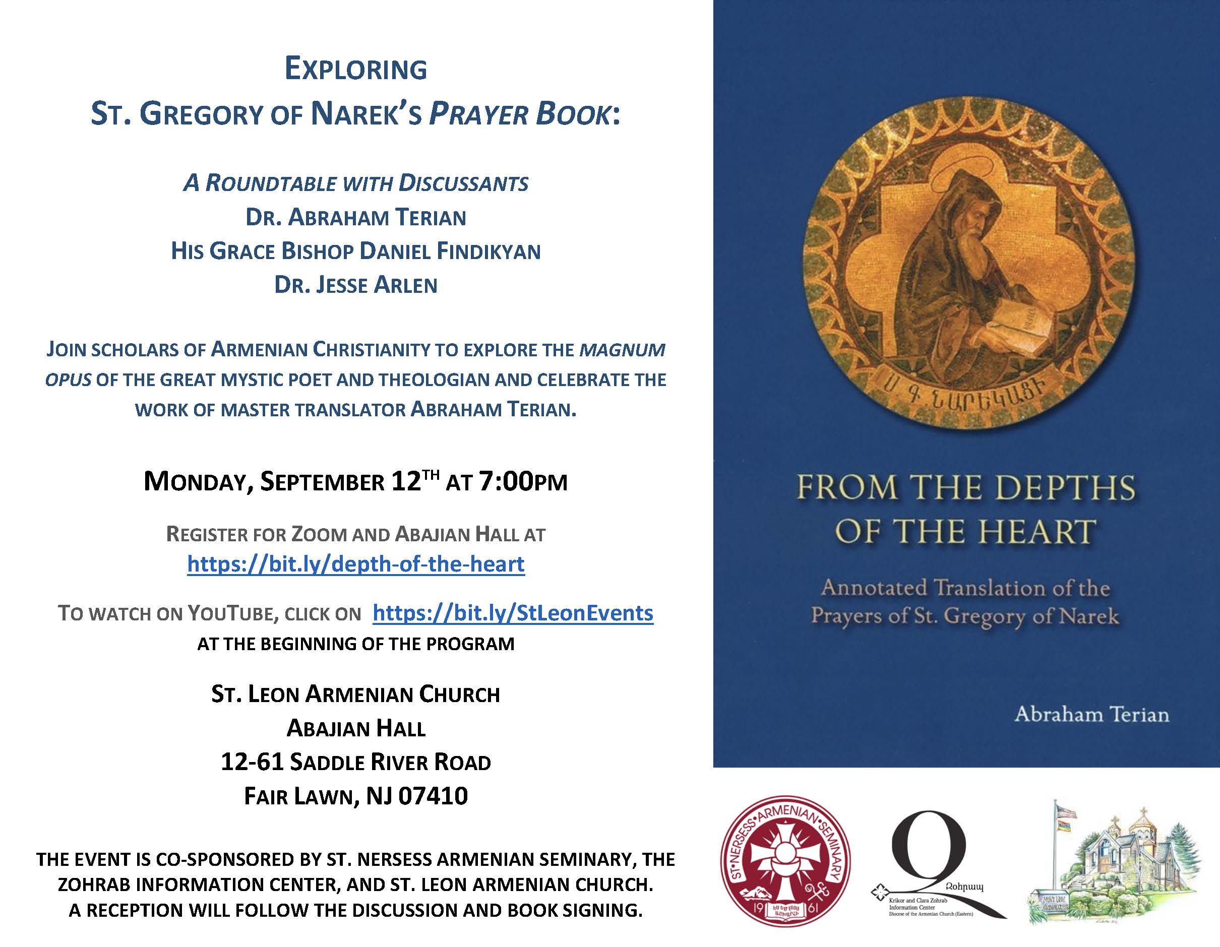 The Eastern Diocese’s Krikor and Clara Zohrab Information Center, along with St. Nersess Seminary and St. Leon Church, will sponsor a panel discussion and book signing on Monday, Sep. 12, at 7 p.m. EDT, in Abajian Hall of St. Leon Church (12-61 Saddle River Rd., Fair Lawn, NJ). Dr. Abraham Terian will present his new book, From the Depths of the Heart: An Annotated Translation of the Prayers of St. Gregory of Narek, and discuss it on a panel featuring Bishop Daniel Findikyan and Dr. Jesse Arlen. A book signing and reception will follow. The event will also be broadcast online over the Zoom platform. Click here to register for both the live and online events. (Watch the online broadcast on the St. Leon Church YouTube channel.) Click here to view a flyer; learn more on the Zohrab Center website.