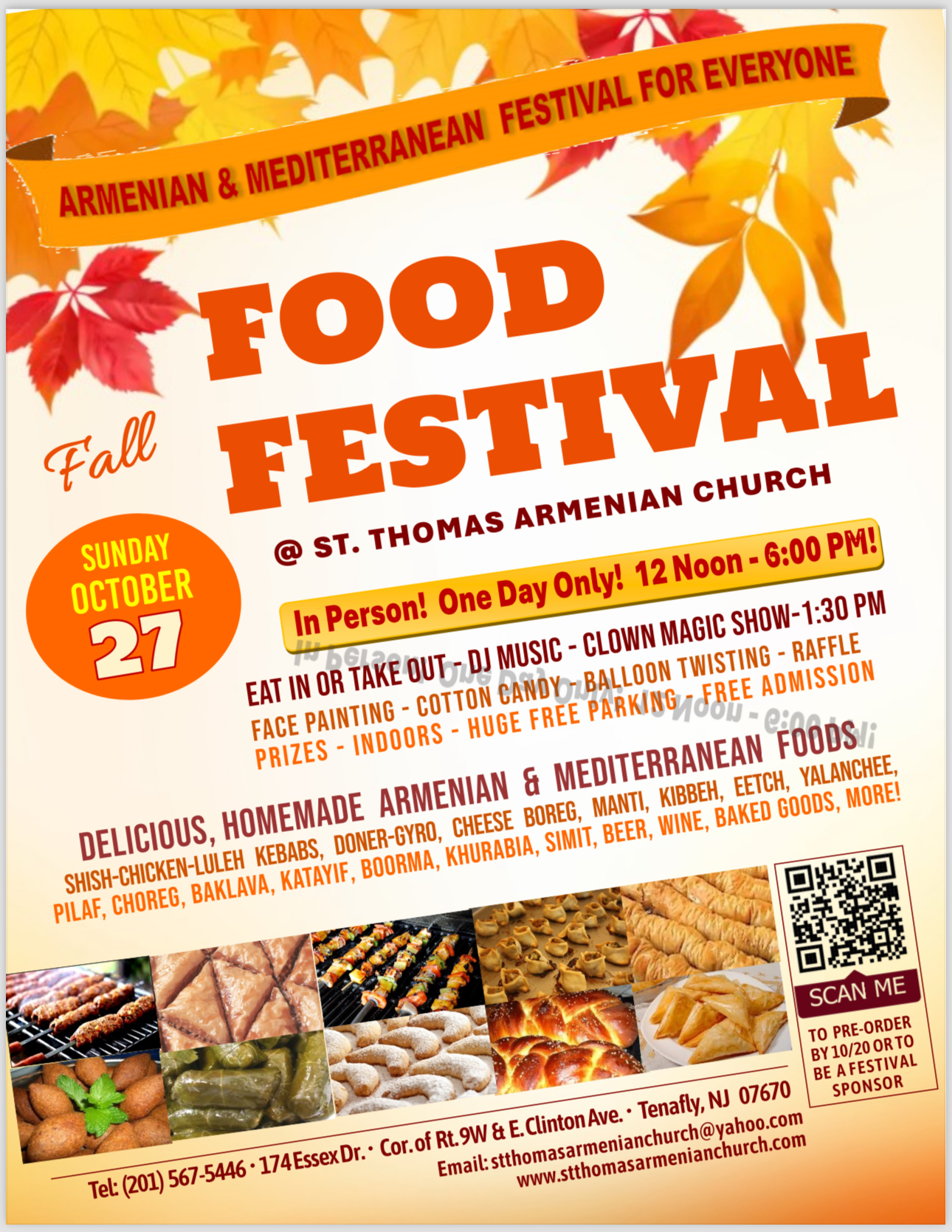 St. Thomas Church of Tenafly, NJ, will host its “Fall Food Festival” on Sunday, Oct. 27, 12 noon-6 p.m., in the church halls (174 Essex Dr., corner Rt. 9W & E. Clinton Ave., Tenafly). Featuring traditional Armenian cuisine, for eating in or taking out. Entertainment includes a clown magician (at 1:30 p.m.), balloon twisting, raffles, and music. Option to order online in advance (order by Oct. 22, pick up Oct. 27); click here to pre-order. Sponsorships available. For information, call (201) 567-5446, or access the parish website. Click the link to view a flyer.