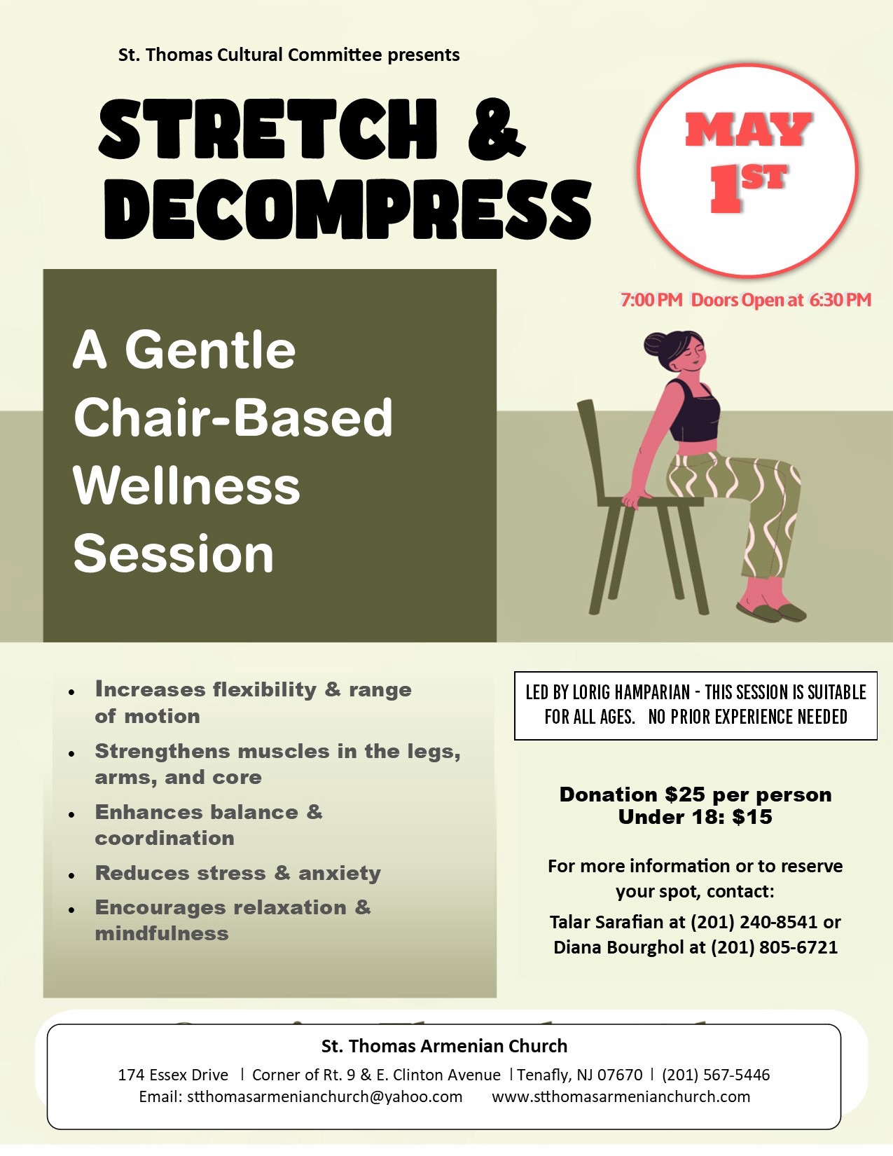 The Cultural Committee of St. Thomas Church (Tenafly, NJ) will present Stretch & Decompress: A Gentle Chair-Based Wellness Session, on Thursday, May 1, at 7p.m., at the church. Lorig Hamparian will lead a gentle, accessible movement session designed to improve flexibility, strength, and balance. Suitable for all levels, no prior experience needed. Click here to view a flyer with reservation and contact information.