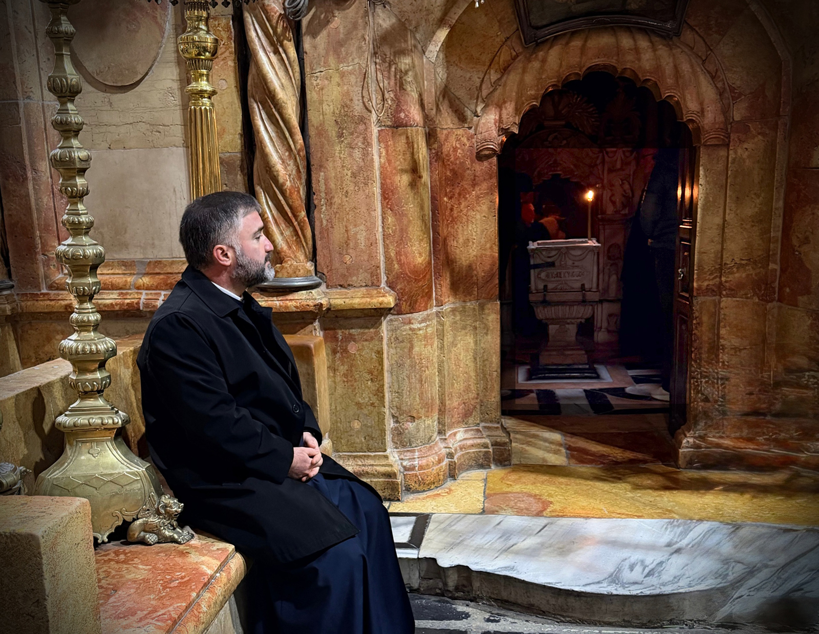 Above: Seated before the Church of the Holy Sepulcher in Jerusalem during the Diocese’s Holy Land Pilgrimage last January, Bishop Mesrop sits in the place outside Christ’s tomb once occupied by Mary the Mother of Jesus and Mary Magdalene.